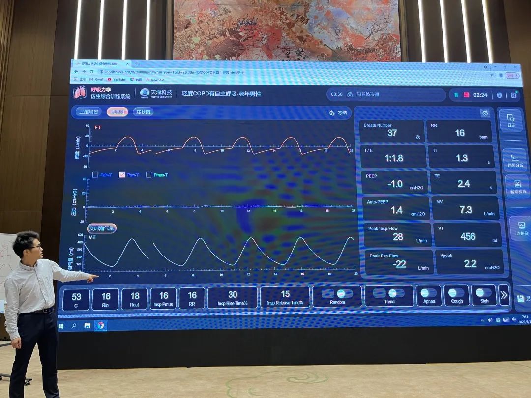 在本次会议中,来自天津医科大学总医院的李晨主任在讲授主旨为“呼吸机基本操作”的论坛讲座时,使用乐鱼在线平台-乐鱼在线官网的“模拟肺”模拟了“复苏后自主循环恢复,无自主呼吸”、“重症肌无力患者,有较多自主呼吸但不稳定”、“肺炎,自主呼吸较强且稳定”、“创伤后呼吸困难3天,确认为ARDS”等多种不同疾病状态下患者的呼吸运动变化,结合真实呼吸机操作时的即时动态反馈,达到了很好的授课效果并收获了现场的一致好评。
